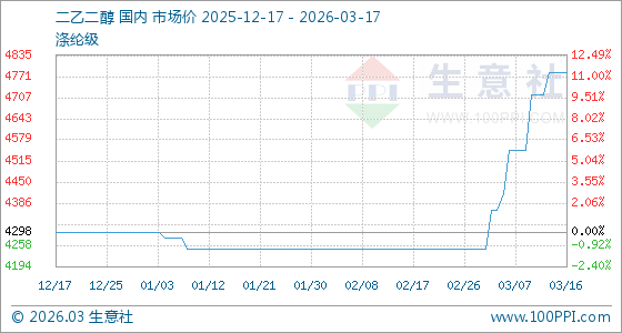 3月17日,生意社二乙二醇基准价为4781.67吨,与本月初(4248.33吨)相比,上涨了12.55%。