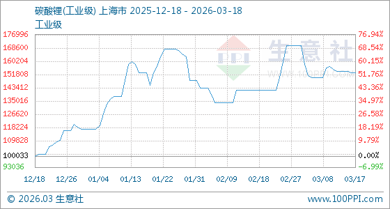 3月18日生意社碳酸锂(工业级)基准价为153000.00元/吨