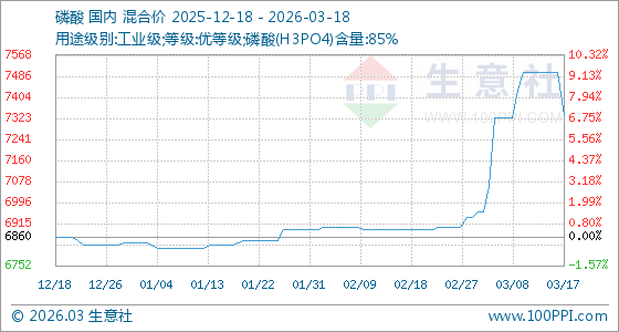 3月18日,生意社磷酸基准价为7333.33元/吨,与本月初(6940.00元/吨)相比,上涨了5.67%。