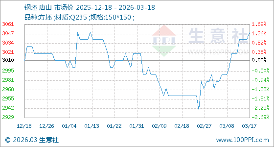 3月18日,生意社钢坯基准价为3050.00元/吨,与本月初(2980.00元/吨)相比,上涨了2.35%。