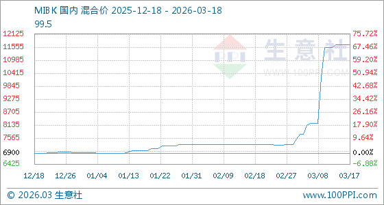 3月18日,生意社MIBK基准价为11650.00元/吨,与本月初(7283.33元/吨)相比,上涨了59.95%。