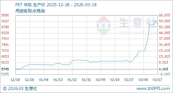 3月18日,生意社PET基准价为8935.00元/吨,与本月初(6322.50元/吨)相比,上涨了41.32%。