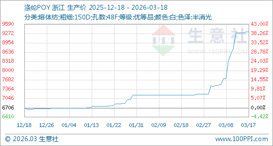 3月18日,生意社涤纶POY基准价为9325.00元/吨,与本月初(7187.50元/吨)相比,上涨了29.74%。