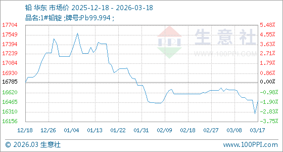 3月18日,生意社铅基准价为16495.00元/吨,与本月初(16655.00元/吨)相比,下降了0.96%。