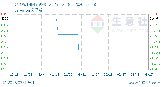 3月18日,生意社分子筛基准价为8200.00元/吨,与本月初持平。