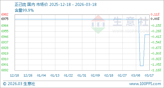 3月18日,生意社正己烷基准价为6950.00元/吨,与本月初(6975.00元/吨)相比,下降了0.36%。