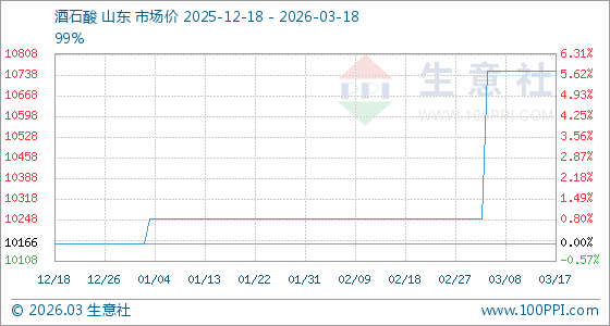 3月18日,生意社酒石酸基准价为10750.00元/吨,与本月初(10250.00元/吨)相比,上涨了4.88%。