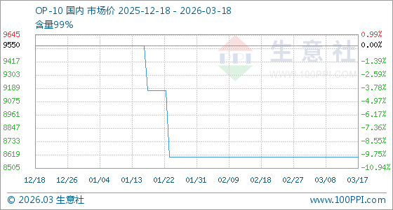 3月18日,生意社OP-10基准价为8600.00元/吨,与本月初持平。