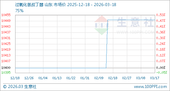 3月18日,生意社过氧化氢叔丁醇基准价为10450.00元/吨,与本月初持平。
