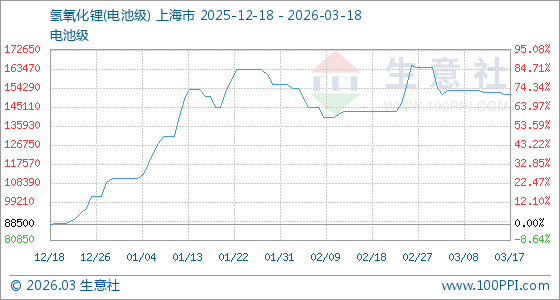 3月18日生意社氢氧化锂(电池级)基准价为151000.00元/吨