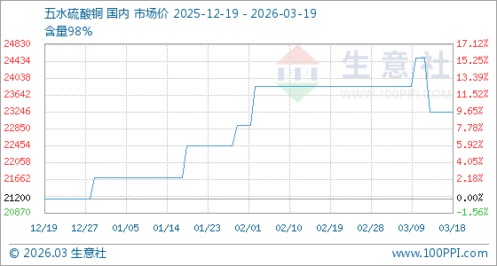 3月19日,生意社五水硫酸铜基准价为23233.33元/吨,与本月初(23850.00元/吨)相比,下降了2.59%。