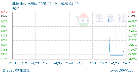 3月19日,生意社乳酸基准价为7962.50元/吨,与本月初(8200.00元/吨)相比,下降了2.9%。
