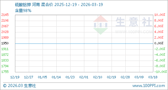 3月19日,生意社硫酸铝钾基准价为1950.00元/吨,与本月初持平。