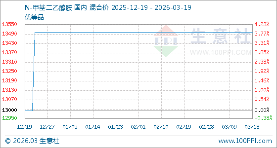 3月19日,生意社N-甲基二乙醇胺基准价为13500.00元/吨,与本月初持平。