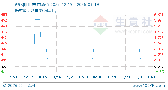 3月19日生意社碘化钾基准价为432.00元/公斤