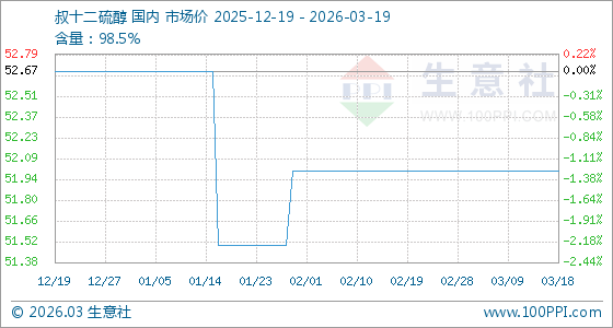 3月19日生意社叔十二硫醇基准价为52.00元/千克
