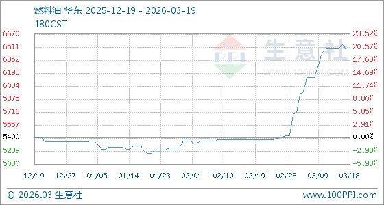 3月19日,生意社燃料油基准价为6487.50元/吨,与本月初(5425.00元/吨)相比,上涨了19.59%。