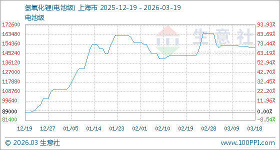 3月19日生意社氢氧化锂(电池级)基准价为151000.00元/吨