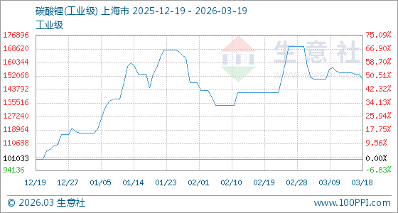 3月19日生意社碳酸锂(工业级)基准价为150000.00元/吨