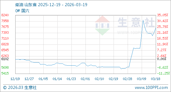 3月19日,生意社柴油基准价为7633.00元/吨,与本月初(5736.60元/吨)相比,上涨了33.06%。