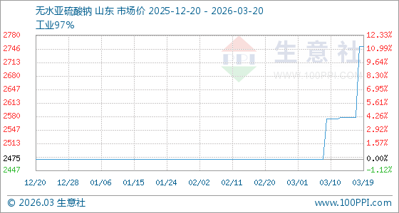 3月20日生意社无水亚硫酸钠基准价为2752.50元/吨