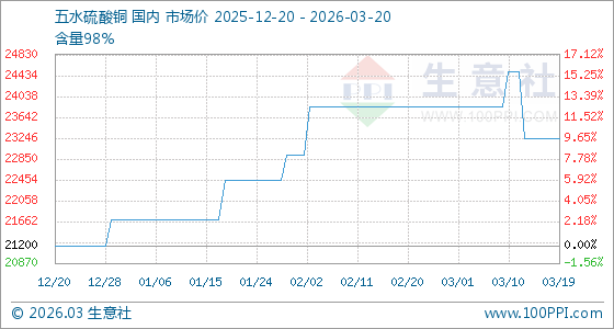 3月20日,生意社五水硫酸铜基准价为23233.33元/吨,与本月初(23850.00元/吨)相比,下降了2.59%。