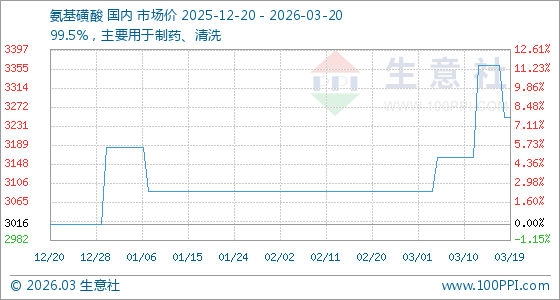3月20日,生意社氨基磺酸基准价为3250.00元/吨,与本月初(3087.50元/吨)相比,上涨了5.26%。