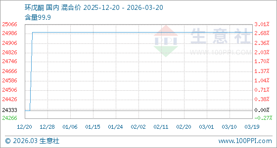 3月20日,生意社环戊酮基准价为25000.00元/吨,与本月初持平。