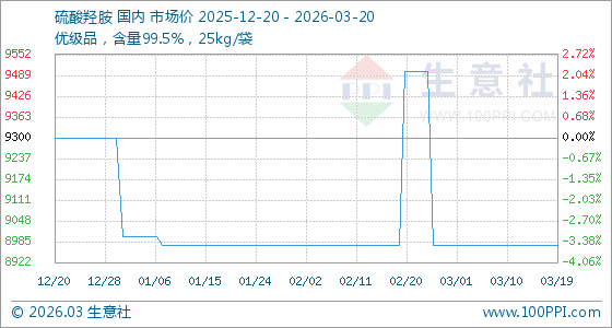 3月20日,生意社硫酸羟胺基准价为8975.00元/吨,与本月初持平。