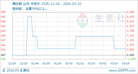 3月20日生意社碘化钾基准价为432.00元/公斤