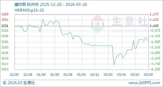 3月20日生意社螺纹钢基准价为3184.00元/吨