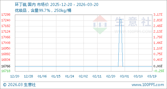 3月20日,生意社环丁砜基准价为16766.67元/吨,与本月初持平。