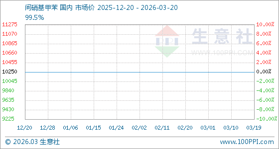 3月20日,生意社间硝基甲苯基准价为10250.00元/吨,与本月初持平。