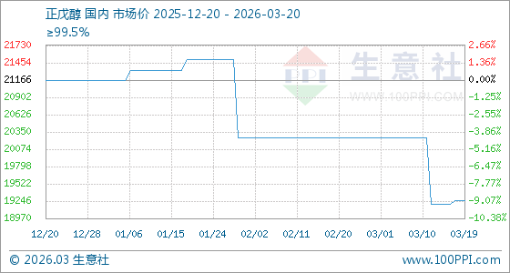 3月20日,生意社正戊醇基准价为19250.00元/吨,与本月初(20250.00元/吨)相比,下降了4.94%。