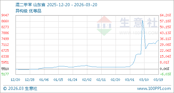 3月20日,生意社混二甲苯基准价为7430.75元/吨,与本月初(5670.00元/吨)相比,上涨了31.05%。
