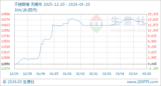 3月20日,生意社不锈钢卷基准价为14220.00元/吨,与本月初(14262.50元/吨)相比,下降了0.3%。