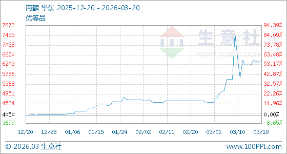 3月20日,生意社丙酮基准价为6400.00元/吨,与本月初(4600.00元/吨)相比,上涨了39.13%。