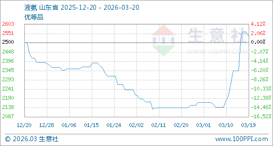 3月20日,生意社液氨基准价为2536.67元/吨,与本月初(2166.67元/吨)相比,上涨了17.08%。