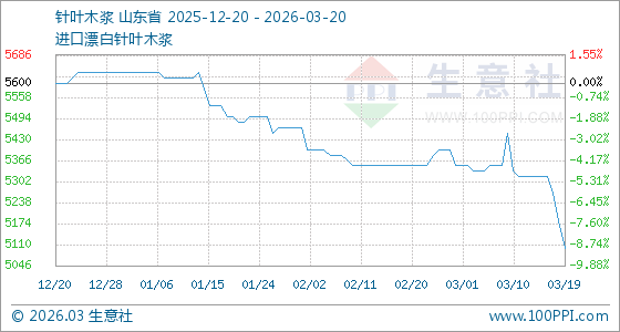 3月20日,生意社针叶木浆基准价为5100.00元/吨,与本月初(5350.00元/吨)相比,下降了4.67%。