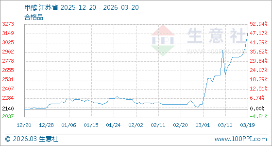 3月20日,生意社甲醇基准价为3170.00元/吨,与本月初(2200.00元/吨)相比,上涨了44.09%。