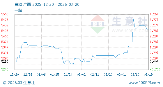 3月20日,生意社白糖基准价为5433.33元/吨,与本月初(5316.67元/吨)相比,上涨了2.19%。