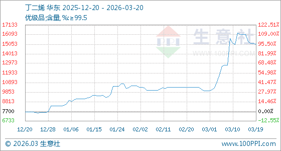 3月20日生意社丁二烯基准价为15100.00元/吨