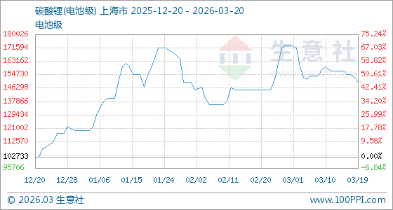 3月20日生意社碳酸锂(电池级)基准价为150000.00元/吨