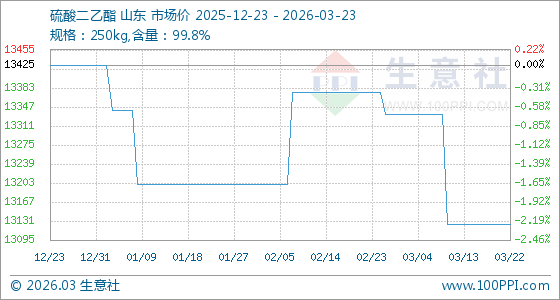 3月23日生意社硫酸二乙酯基准价为13125.00元/吨