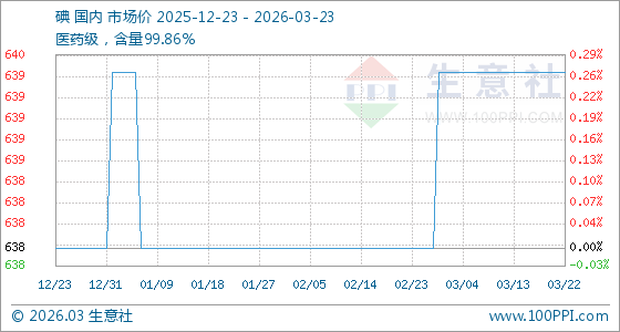 3月23日,生意社碘基准价为640.00元/千克,与本月初持平。