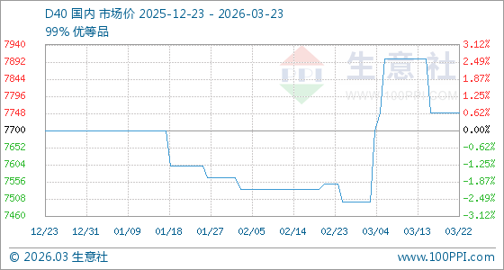 3月23日,生意社D40基准价为7750.00元/吨,与本月初(7500.00元/吨)相比,上涨了3.33%。