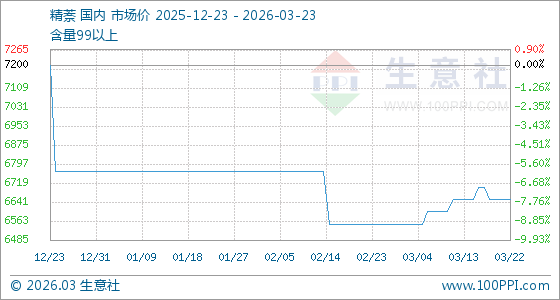 3月23日,生意社精萘基准价为6650.00元/吨,与本月初(6550.00元/吨)相比,上涨了1.53%。