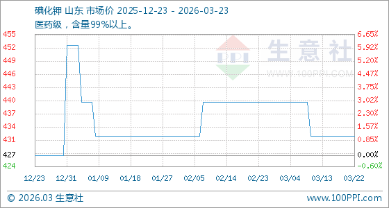 3月23日生意社碘化钾基准价为432.00元/公斤