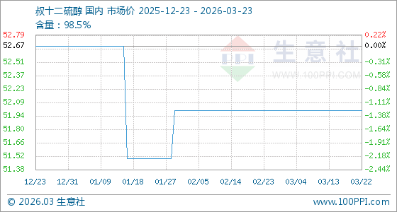 3月23日生意社叔十二硫醇基准价为52.00元/千克