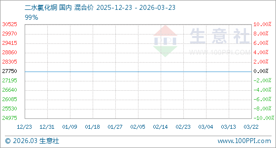 3月23日,生意社二水氯化铜基准价为27750.00元/吨,与本月初持平。